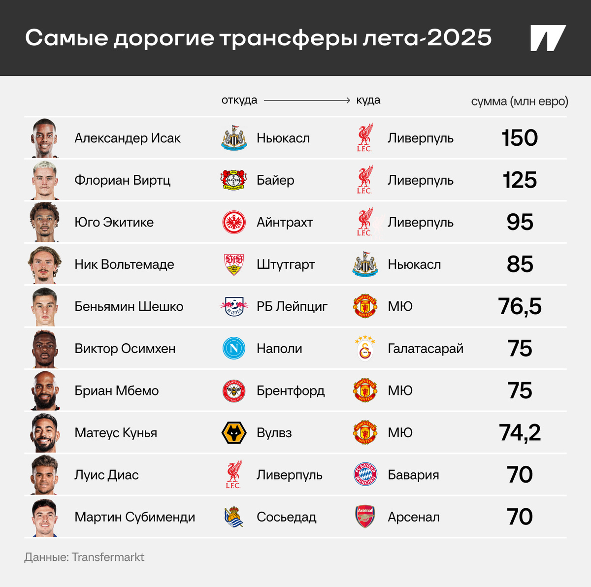 Летнее трансферное окно – все. Пора взглянуть на главные сделки в 2025-м, особенно мощно потратился «Ливерпуль». 🤑 «Ливерпуль» – главный транжира этого лета. Всего потратили 483 млн евро – почти полмиллиарда! В тройке самых дорогих трансферов – Александер Исак (150 млн), Флориан Виртц (125) и Юго Экитике (95). 🤑 Александер Исак – третий по стоимости трансфер в истории футбола. Больше платили только за Килиана Мбаппе (180 млн) и Неймара (222) – оба раза тратился «ПСЖ». Швед стоит 150 с учетом бонусов. 🤑 У «МЮ» аж три дорогих покупки. Беньмин Шешко, Бриан Мбемо и Матеус Кунья в сумме стоили 225 млн – тоже очень прилично. 🤑 Рекордная покупка для всей Турции – поход за Виктором Осимхеном: «Галатасарай» отдал «Наполи» 75 млн. Единственная сделка в списке с участием клуба не из топ-лиги. 🤑 Рядом с десяткой – Эберечи Эзе (из «Пэлас» в «Арсенал» за 69 млн), Матео Ретеги (из «Аталанты» в СА за 68) и Виктор Дьокереш (из «Спортинга» в «Арсенал» за 65,8). 🤑 «Челси» побил рекорд АПЛ по выручк
