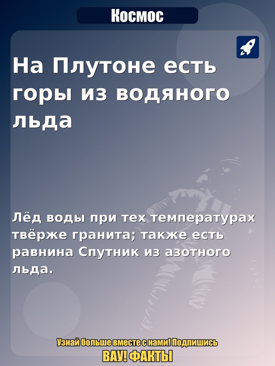 На Плутоне есть горы из водяного льда. Лёд воды при тех температурах твёрже гранита; также есть равнина Спутник из азотного льда. Интересный факт по теме «Космос»: На Плутоне есть горы из водяного льда. Почему так: Лёд воды при тех температурах твёрже гранита; также есть равнина Спутник из азотного льда.. Поделитесь в комментариях, знали ли вы об этом и стоит ли делать продолжение по теме. #космос #факты #астрономия