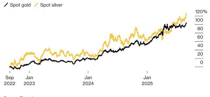 Многолетнее ралли на рынках драгоценных металлов ускорилось: инвесторы ждут, что Федрезерв снизит ставку, и пытаются понять, как действия Трампа повлияют на судьбу Центробанка Цены на золото и серебро растут три года без остановки. Источник: Bloomberg В начале азиатской торговой сессии во вторник спотовое золото подорожало 0,9%, достигнув $3508,73 за унцию и превысив предыдущий пик. Драгоценный металл в этом году вырос более чем на 30%, став одним из самых доходных основных сырьевых товаров. В прошлом месяце глава ФРС Джером Пауэлл осторожно намекнул на возможность снижения ключевой ставки, усилив тем самым инвестиционный интерес к золоту. Публикуемый в эту пятницу ключевой отчет по занятости в США, вероятно, добавит признаков все более ослабевающего рынка труда и поддержит аргументы в пользу снижения ставок. Это еще больше повысило привлекательность драгоценных металлов, которые не приносят процентного дохода. «Инвесторы, увеличивающие долю золота в своих портфелях, особенно на фоне п