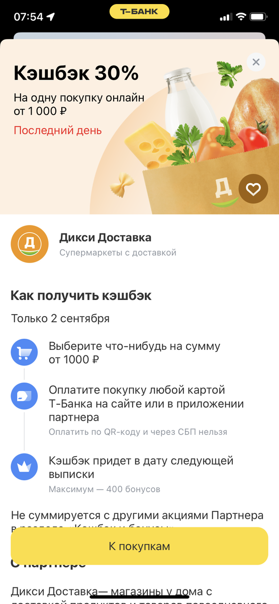 Зашла я в приложение т-банка, а здесь сюрпризик: кэшбек 30% при заказе продуктов в магазине Дикси. Действует только онлайн и только один день. Но что очень приятно, всего ли от 1000 рублей, но максимальный кэшбек 400 рублей. По моему очень сильно не дурно. Кому нужны продукты или хозтовары думаю надо воспользоваться этим предложением сегодня