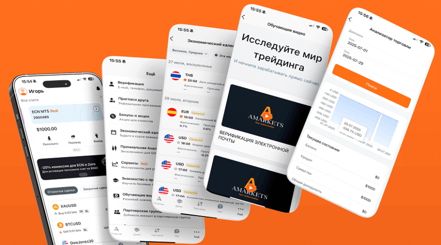AMarkets полностью обновили приложение, чтобы ваш трейдинг стал еще быстрее, удобнее и продуктивнее. Теперь это не просто инструмент, а настоящий помощник, который открывает для вас новые возможности. Представляем сразу 9 новых функций! 1. Быстрый старт Мы сделали удобный онбординг, чтобы новые клиенты могли познакомиться с приложением всего за минуту. А если вам понадобится освежить знания, вы всегда можете пройти его еще раз в разделе «Еще» — «Знакомство с приложением». 2. Бонусы и акции Все уникальные и выгодные предложения теперь собраны в одном разделе — «Бонусы и акции». Вам больше не придется их искать, и вы всегда будете в курсе самых интересных промо. 3. Обзор сделок Отслеживайте и контролируйте свои ордера прямо с главного экрана — торговый процесс стал еще удобнее. 4. Экономический календарь С функцией встроенного календаря вы можете планировать свои сделки с учетом важных фундаментальных новостей. 5. Обучающие видео По вашим запросам мы создали целый раздел с видеоуроками.