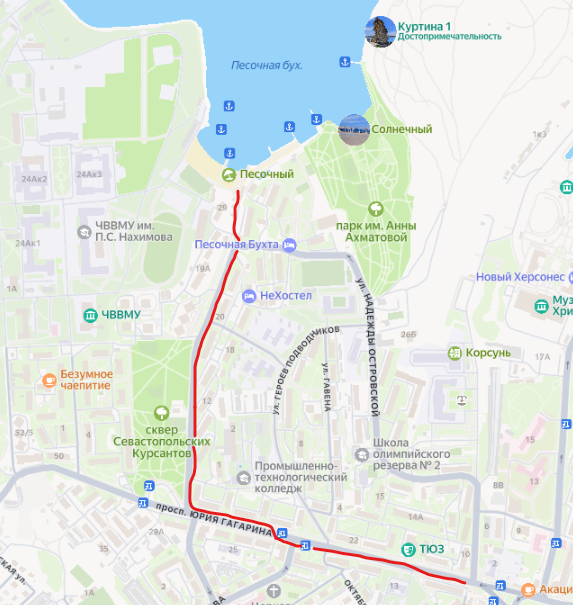 Рядом с этим пляжем (справа) находится отель, парк и пляж «Песочная бухта», а за ним — «Солнечный». А ещё на фото вдалеке можно увидеть Херсонес Таврический.