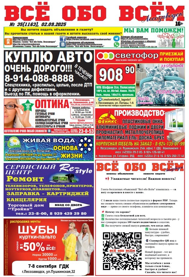 Новый номер газеты "Всё обо Всём" Лесозаводск от 2 сентября можно скачать по ссылке