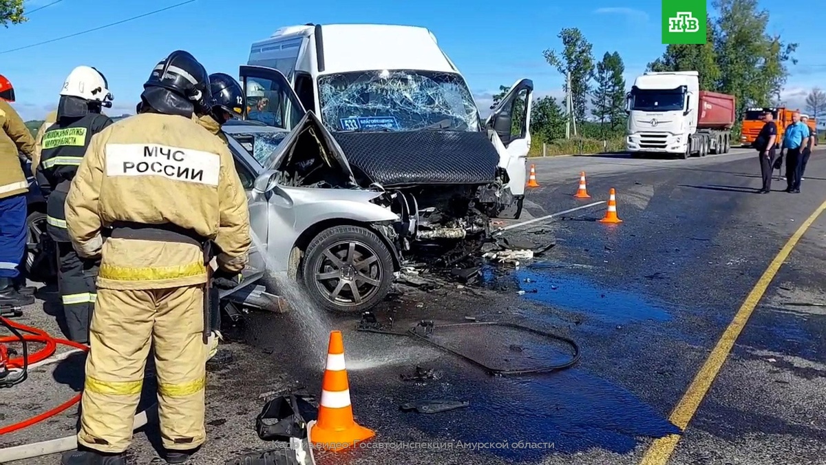 [ Смотреть видео на сайте НТВ ] По предварительным данным, не менее 19 человек пострадали в автокатастрофе под Благовещенском. ДТП с участием маршрутного автобуса произошло на автодороге «Благовещенск — Свободный» в Амурской области. Как сообщили в МВД, произошло столкновение автомобиля Toyota Crown и маршрутного автобуса Iveco, есть пострадавшие. На месте аварии работают сотрудники экстренных служб. В Госавтоинспекции уточнили, что в результате автокатастрофы в больницу были доставлены 19 человек, включая четверых несовершеннолетних. В соцсетях уже появились первые кадры с места аварии, на них видно, что на дороге из-за ДТП образовались пробки. По материалам: Telegram-канал Госавтоинспекции Амурской области. [ Смотреть видео на сайте НТВ ]