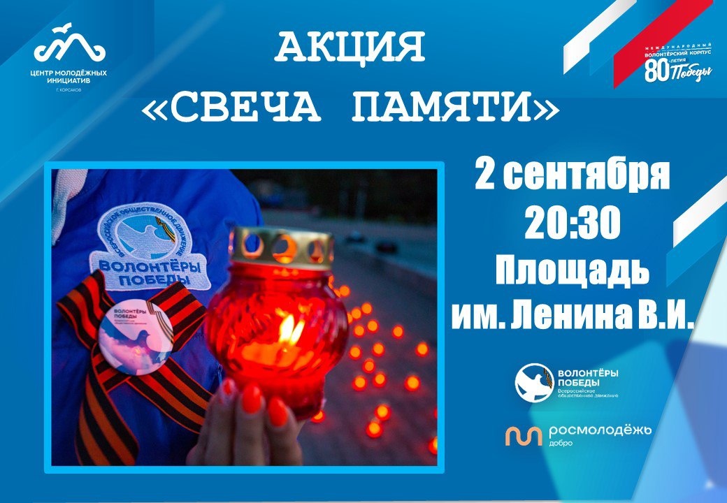 Приглашаем вас присоединиться к памятной акции «Свеча памяти» СЕГОДНЯ в 20:30 на площади им. В.И. Ленина В этом году мы отмечаем особую, юбилейную дату – 80-летие окончания Второй Мировой войны и освобождения Сахалина и Курильских островов от японских милитаристов. Это событие навсегда вписано в летопись нашей страны и нашей малой родины как символ мужества, стойкости и великого подвига советского солдата. В этот вечер мы соберёмся все вместе, чтобы склонить головы перед памятью воинов-освободителей, которые отдали свои жизни за мирное небо над нашими головами. Волонтёры Победы зажгут первые свечи, образующие символ вечного огня — знак нашей незабвенной памяти. Приносите свои свечи, чтобы присоединиться к акции и лично почувствовать силу общего единства и скорби. Почтим память героев вместе. @cmi_korsakov65