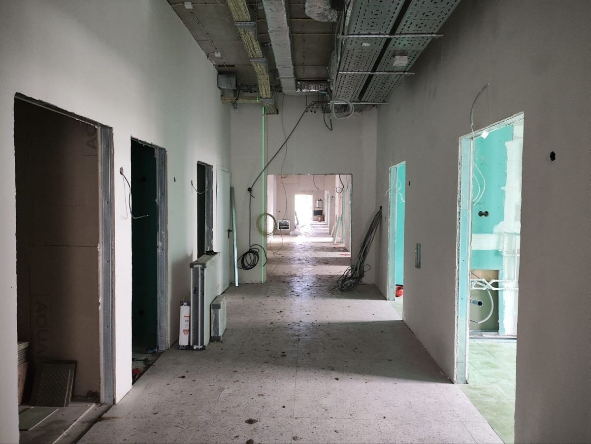 Сейчас строители ведут монтаж систем вентиляции и дымоудаления, прокладывают электросети первого этажа, возводят перегородки из гипсокартона и укладывают керамогранит на полы. На втором этаже продолжается устройство вентилируемого фасада, монтаж отопления и внутреннего водопровода. Начались и работы по благоустройству территории вокруг здания.