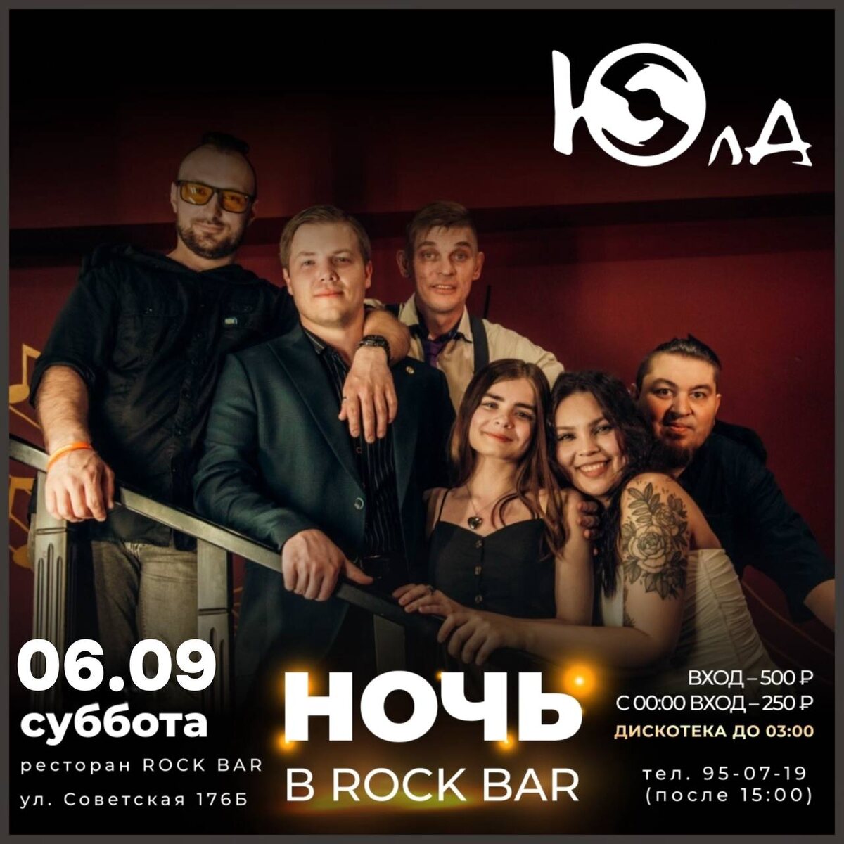 6 СЕНТЯБРЯ СБ. ”НОЧЬ В ROCK BAR” 21:30-03:00 ГРУППА "ЮЛА" & ДИСКОТЕКА В эту ”Ночь“ на сцене группа "ЮЛА" с классными композициями от диско до рока, а в продолжении - дискотека из хитов всех стилей и времён! Вход 500₽, с 00:00 - 250₽ ✅ Уважаемые гости! Пожалуйста, если Вы опаздываете, позвоните или напишите нам, при опоздании более 15 минут без предупреждения бронь может сниматься. АС 18+ FC/DC Данная публикация носит исключительно информационный характер. 📞INFO/RV (с 15:00) +7-9148-95-07-19 💻 INFO/RV: www.rockbar38.ru 📍г.Иркутск, ул. Советская 176Б
