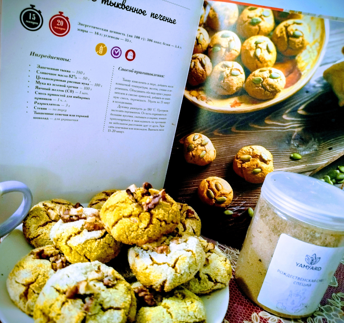 Привет всем! Сегодня готовим ароматное печенье с тыквой. 🎃 Уже настал её час,🕘 если её много уродилось , то хранить её можно до 3-4 месяцев, а некоторые сорта и более. Или просто купить и готовить в удовольствие. Порой нарезаю на небольшие кусочки тыкву, посыпаю сахаром и запекаю в духовке, подлив небольшое количество воды. Потом потихоньку использую в выпечке, ем как десерт с чайком 🍵, добавляю в каши 🥣. Делала по рецепту Д. Третьяковой и Д. Савельевой из "Чистого питания", только в конце обваливала печенье в кокосовой муке и украсила грецким орехом, а не тыквенными семенами. С рождественской приправой (о ней будет отдельно постик) очень пикантный вкус, Рождество в голове и любовь в сердце к тыкве 🎃 несравненной🥰 И еще один рецепт печенья ( автор неизвестен) более постный, т.к. нет масла в ингредиентах. Хотя один ценитель и вариант с маслом назвал постным, т.к. не очень сладко, а "надо чтоб сахар на зубах скрипел"😁 Тыквенное печенье без масла отварная тыква – 100 г. яйцо –