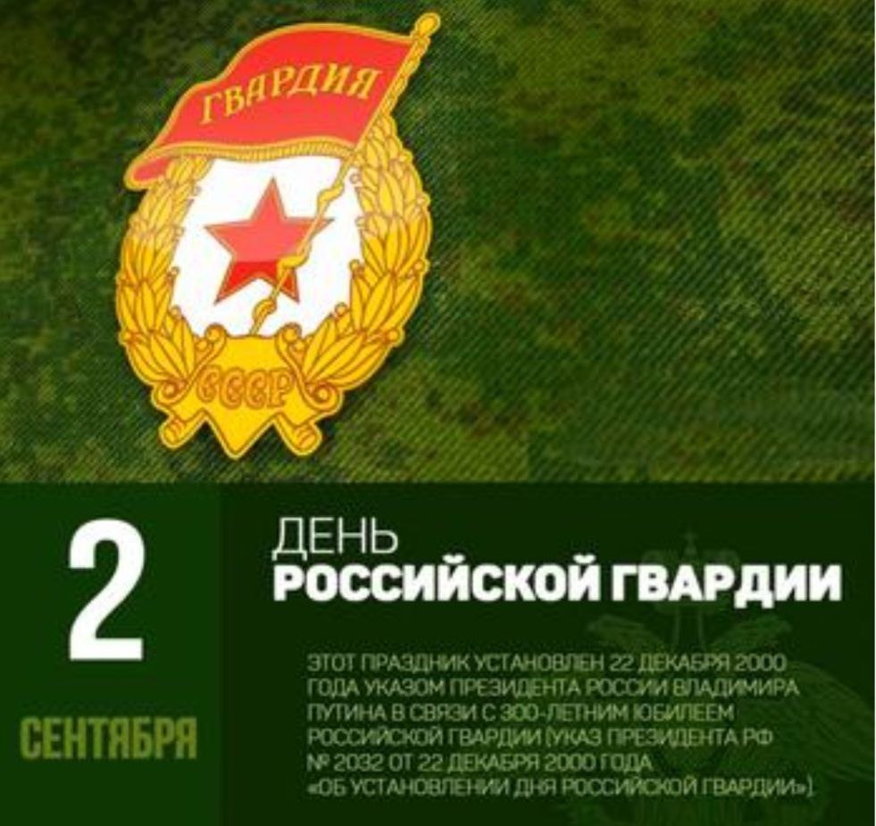 Российская Императорская Гвардия была создана в начале царствования Петра Первого из "потешных войск" в составе Преображенского и Семеновского полков, официально получивших название "гвардейских" в 1700 году. В 1918 году гвардейские части были упразднены вместе с расформированием царской армии, а вновь созданы в годы Великой Отечественной войны (1941—1945). Звание "гвардейский" присваивалось воинским частям, кораблям, соединениям и объединениям советских Вооруженных сил, отличившимся в боях во время Великой Отечественной войны. Воинское формирование получало гвардейское знамя, а личный состав — гвардейское звание и нагрудный знак. В апреле 2016 года Указом Президента РФ была создана Федеральная служба войск национальной гвардии Российской Федерации, в структуру которой вошли также и войска национальной гвардии РФ, созданные тогда же на базе Внутренних войск МВД России. Росгвардия наряду с ФСБ, СВР, ФСО, ГФС и ФСТЭК относится к "силам и средствам обеспечения безопасности", то есть к