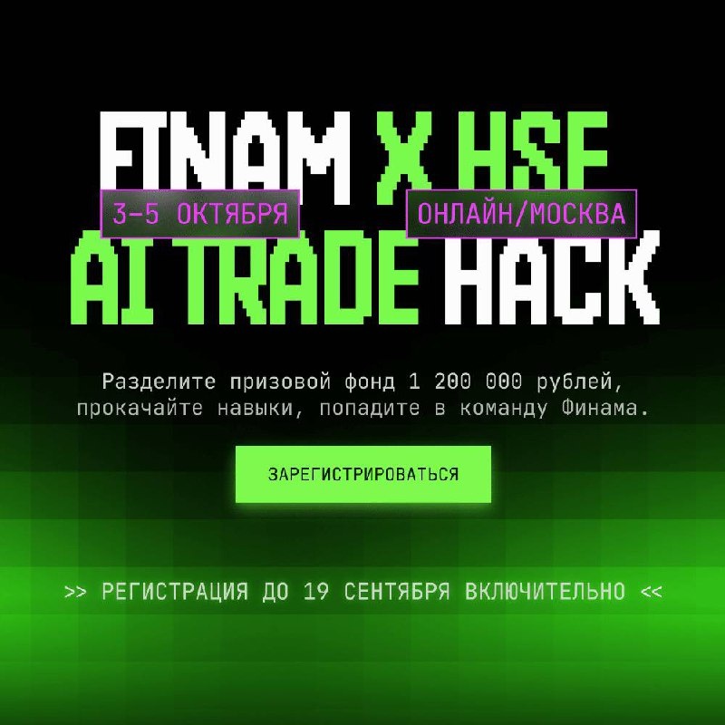 Finam X HSE AI Trade Hack: Хакатон для настоящих FinTech-энтузиастов Хотите прокачать навыки в AI и трейдинге? Готовы создавать инновационные решения для финтеха? Тогда не упустите шанс принять участие в Finam AI Trade Hack — хакатоне от одного из ведущих брокеров на российском рынке «Финам»! ⏰ Регистрация до 19 сентября 23:59 💰 Призовой фонд: 1 200 000 руб. Треки хакатона: Forecast Прогноз динамики цен с учётом новостей. Задача: предсказать котировки на N дней вперёд, используя временные ряды и новостной контекст. Trader LLM-интерфейс к Trade API Задача: реализовать MCP-сервер для получения рыночных данных и выполнения торговых операций через API FINAM. Radar Поиск горячих финансовых новостей. Задача: создать сервис для автоматического поиска, анализа и оценки новостей, с возможностью генерировать черновики статей и постов. Почему стоит участвовать: 🔸 Денежные призы 🔸 Оффер на работу в «Финаме» 🔸 Стильный мерч 🔸 Менторская поддержка 🔸 Доступ к API LLM ➡️ Подробная информ