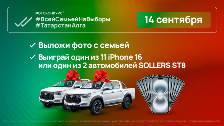 Организаторы масштабного фотоконкурса* #ВсейСемьейНаВыборы #ТатарстанАлга опубликовали расписание розыгрышей 2 автомобилей Sollers ST8 и 11 смартфонов iPhone 16 в день выборов Раиса Республики Татарстан 14 сентября. Обладателя первого внедорожника определят в 12:00 по мск, а второго – в 21:30** по мск. Кроме того, в течение дня разыграют 11 смартфонов (розыгрыши запланированы ежечасно** с 9:00 по мск). Принять участие в фотоконкурсе может каждая семья республики Татарстан, выложив фото в день выборов Раиса РТ с 07:00 до 20:00.