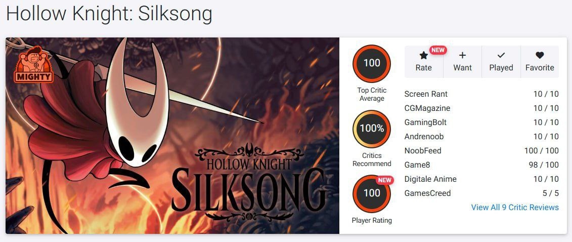 Исторический момент: Silksong получила 100/100 баллов на Opencritic Это уникальнейшая ситуация — пока что оценка основана на 9 рецензиях журналистов, которые прошли игру до конца. При этом тайтл сделали всего 4 человека