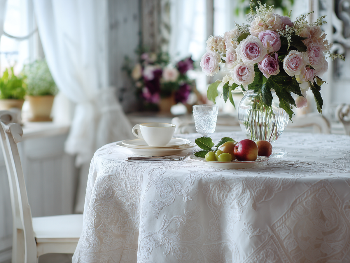 Скатерть с мягким цветочным узором, льняные салфетки, простая посуда с едва заметными неровностями, небольшие букеты в банках или кувшинах — всё это дарит чувство уюта и непринуждённости.