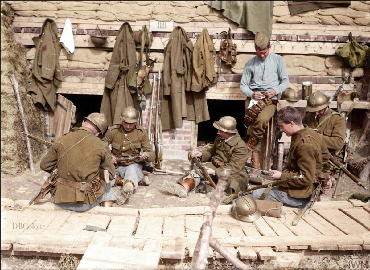 Бельгийские солдаты на линии фронта за чисткой оружия и снаряжения, Бельгия, 9 сентября 1917 года
