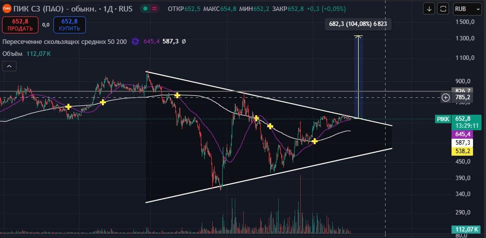 #PIKK #ПИК 📊 Равносторонний треугольник. 🟢 В данный момент трётся ровно у верхней стенки треугольника 666,9, как только пробьет на закрепится пойдёт до следующего уровня сопротивления 826,7. 🔽Если пробить сил не хватит, то есть вероятность вернуться до 493 - там нижняя стенка треугольника, но это маловероятно. Ждут какие-то нас глобальные перемены по пику. 🔼Отработка фигуры до 1343,6. НЕ ИИР