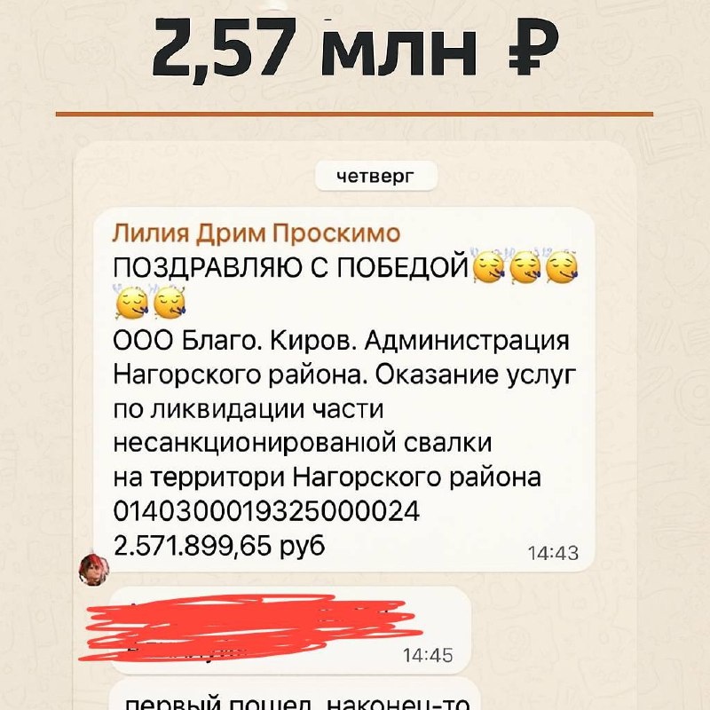 🏆 Победа в Кирове! Всего три месяца назад мы открыли филиал Dream Благо в Кирове. И сегодня — первая крупная победа: 💰 Тендер на 2 571 899 ₽ от администрации. Задача: ликвидация несанкционированной свалки. Результат: контракт у нас. 🔥 Для нас это не просто сумма. Это подтверждение, что модель Dream Благо работает даже в городах, где казалось «невозможно зайти». ⚡ Что важно: — расходы филиала уже закрываются заявками от физлиц и коммерции, — каждый тендер = чистая прибыль, — маржинальность доходит до 74–84%. 👉 Если хотите вместе с нами открыть филиал в своём городе и повторить эту историю — пишите в комментариях слово «БЛАГО». Мы пришлём финансовую модель, инструкцию и выйдем с вами в Zoom для обсуждения деталей. «Пиши слово БЛАГО в комментариях — открой филиал Dream Благо и выходи на тендеры с маржинальностью до 84%».