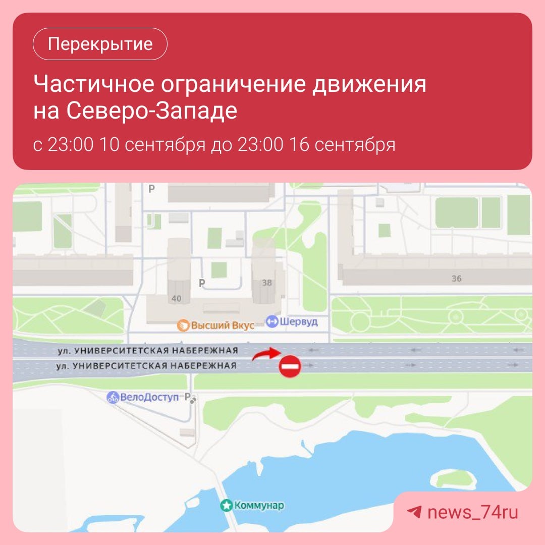 До 16 сентября перекроют Университетскую Набережную возле дома №40а Там будут проводить работы на инженерных сетях. В сторону центра транспорт пустят по встречной полосе.