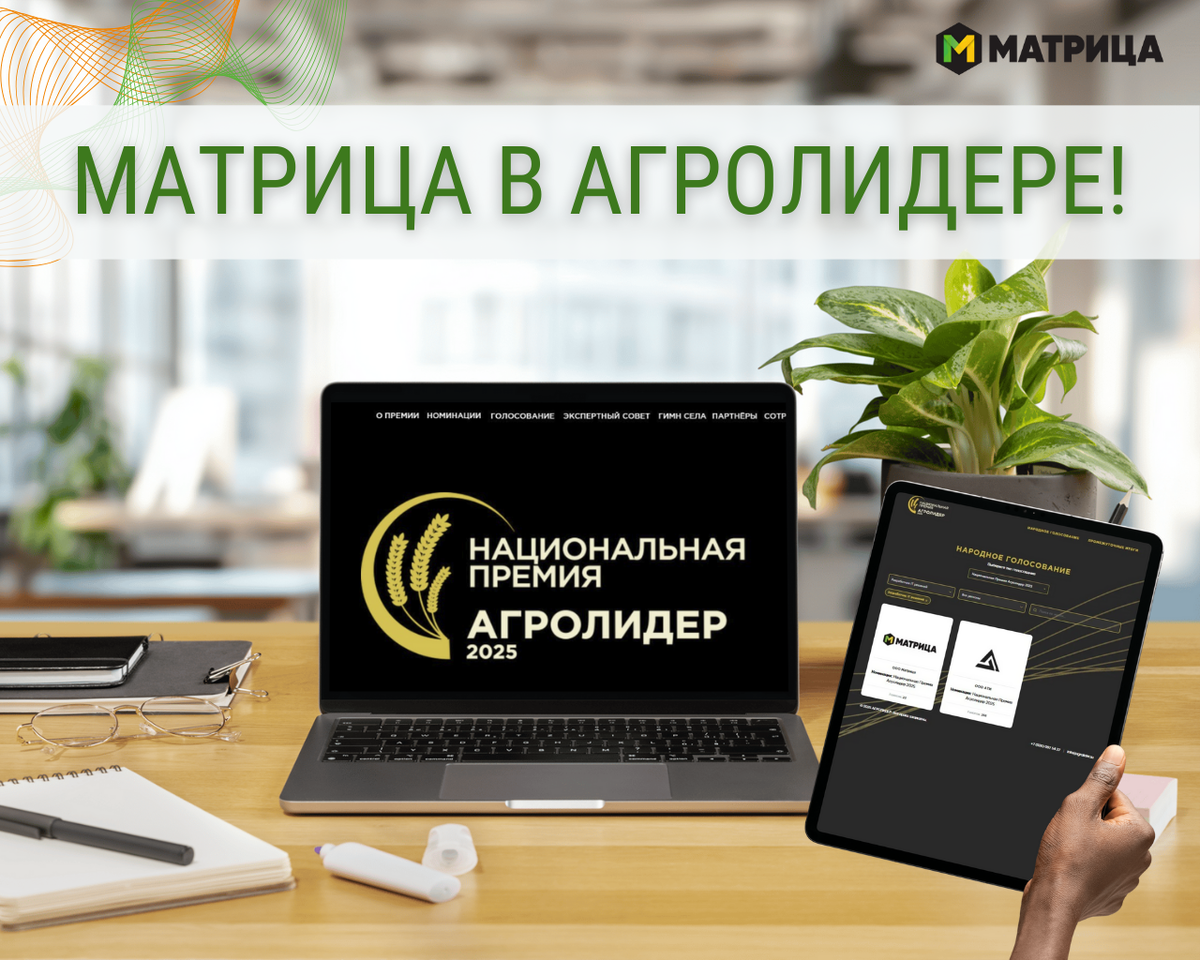 🔥 Компания Матрица принимает участие в конкурсе национальной премии Агролидер 2025. Организаторы проекта - Международная школа агробизнеса, МНова Lab, Медиахолдинг СД Групп. Награждение победителей пройдет в рамках выставки Агравия 21-23 января 2026 года. ❗️Приглашаем вас поддержать нашу компанию и проголосовать в конкурсе! ➡️Голосование идет здесь https://golosovanie.agrolider.su/nominee/ooo-matritsa/