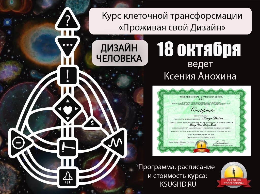 Друзья, жду вас на курсе "Проживая свой Дизайн" уже 18 октября! Ознакомиться, узнать стоимость здесь https://ksughd.ru/page52035873.html Программа и расписание курса здесь https://ksughd.ru/programmaliving У меня для вас море глубоких знаний, четкая информация механики Дизайн Человека на основе того, как давал эту науку Ра Уру Ху. И, конечно, практичная подача того, как проживать эксперимент - через общение, разборы из реальной жизни. Курс пробуждающий, дает отличное твердое обширное основание для грамотного проживания себя и осознанной коммуникации с другими людьми. Записаться, задать вопросы и узнать подробности сюда https://t.me/Kseniya_Anohina Или сюда https://vk.com/idksug_anohina