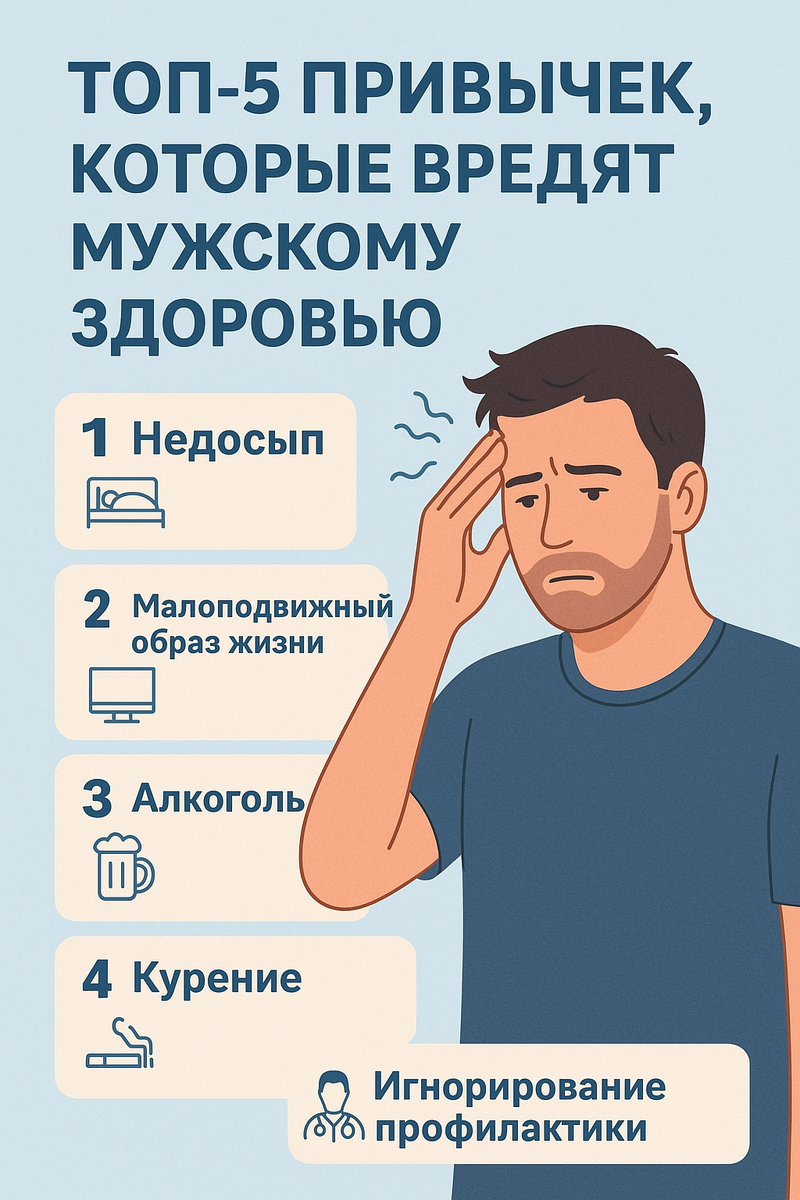 Владимиру 38 лет. Он успешен в работе, но в последнее время стал замечать, что быстро устаёт, вечером нет сил даже поиграть с детьми, а интимная жизнь практически сошла на нет. Вроде бы ничего особенного — чуть больше кофе, немного стресса, лишние 5 килограммов… Но именно такие мелочи часто становятся теми самыми кирпичиками, из которых строятся серьёзные проблемы с мужским здоровьем. Андрологу хорошо известно: за каждой жалобой на «снижение энергии» или «слабую потенцию» нередко стоят повседневные привычки. Давайте разберём наиболее вредные. 1. Хронический недосып Современный мужчина часто считает сон «роскошью». Работа допоздна, сериал, телефон перед сном — и в итоге 5–6 часов сна вместо положенных 7–8.