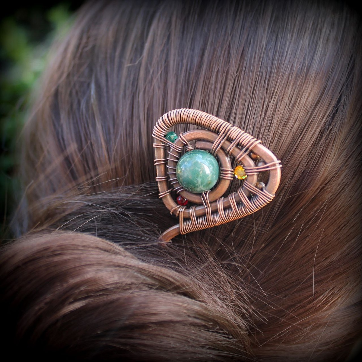Медь прокована для жесткости, затем покрыта патиной и отшлифована. Не цепляет волосы, не царапает кожу, хорошо держит прическу.