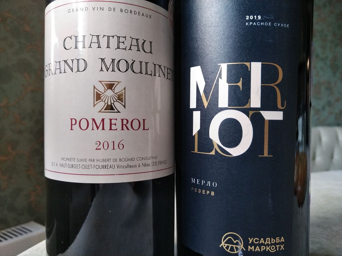 Два мерло в сравнении, кубанский и французский. Только год разный. Цену указал на момент покупки, как правило, год-полтора-два года назад, брал со скидками. Усадьба Маркотх "Мерло Резерв" 2019 Розлив августа-2021, цена 1800 рублей. Сейчас в районе 3-3,5 тысяч. Букет, в основном, вишнёвый, дополненный чёрной смородиной и специями. Возможно, черешня. Во вкусе мощное, насыщенное. Чем дольше дышит, тем лучше становится. Если сначала французское кажется много лучше, то при обратном переходе понимаю, что какое пью, такое и нравится больше. Но наш всё же более тяжеловесный. Терпкость достаточная. Чуть засахаренных ягод в послевкусии. Оцениваю на 89-90 баллов. Grand moulinet 2016 Розлив март-2018. Заезжал в "Ароматный Мир" села Михеево или что-то вроде, где оставалась последняя бутылка вина, по дороге из аэропорта Домодедово. Это уже потом более поздние годы появились в качестве новинки в сети "Глобус". Очень изящно и богато. Табак в вперемежку со сладкими ягодами, травами. Сладкая вишня. Во в