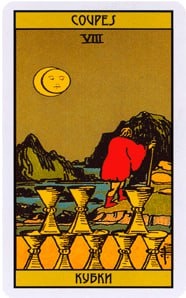 Статья Андрея Вишталя Восьмёрка Кубков — дуальность воды и огня, роль «затмения» Человек уходит от кубков — от того, что было дорого и знакомо. Над ним — луна, скрывающаяся за облаком или как бы «затемнённая» — образ, который можно читать как затмение, как временное помрачение прежнего света. Сам уход — акт движения, но это движение не просто физическое: это ритуал прощания и запрос новизны. Вода ↔️ Огонь — что именно противопоставляется и переплетается: Вода (Кубки) — эмоции, привязанности, память, уют, прежняя сцена отношений и смысла. Она даёт притяжение, питает, удерживает. Огонь (намерение, воля, путь) — стремление, требование смысла, внутренняя искра, зов к действию, готовность к перемене. Восьмёрка показывает не конфликт стихий, а их диалектическое взаимодействие: вода — то, что нужно отпустить, огонь — то, что зовёт идти. Уход — это не отрицание чувств, а их трансформация: вода «испаряется» под воздействием внутреннего огня, превращаясь в пар — образ перехода, психической