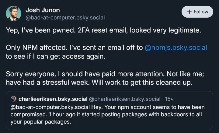 Джаваскриптизёры, доброе утро: в npm всплыли вредоносные версии 18 популярных либ, включая chalk и debug Только за неделю у этих пакетов обычно бывает более 2 млрд скачиваний, и они ставятся транзитивно практически в каждом проекте. Вредонос умело подменяет адреса криптокошельков прямо в браузере, чтобы незаметно тянуть деньги через Web3-интерфейсы. Взлом начался с фишинга одного из мейнтейнеров. 5 сентября — его аккаунт увели и опубликовали заражённые релизы. Проверьте свои lock-файлы и срочно обновляйтесь. Это одна из самых масштабных JS-атак за последнее время! Версии зараженных пакетов оставил в комментах