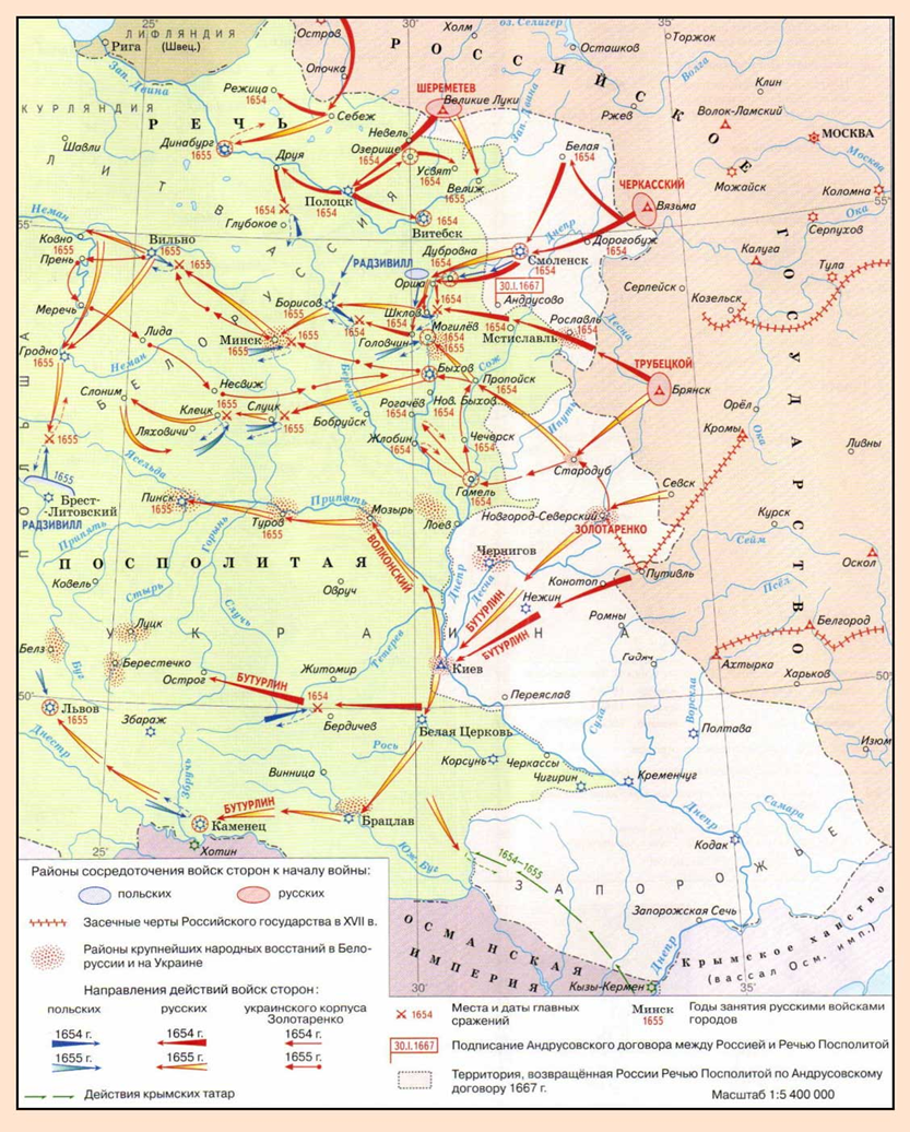 Саму войну с Польшей 1654-1667 можно разделить на 3 военные компании, которые прерывались перемириями, а также войной со Швецией. Рассмотрим подробнее каждый из этих этапов.
