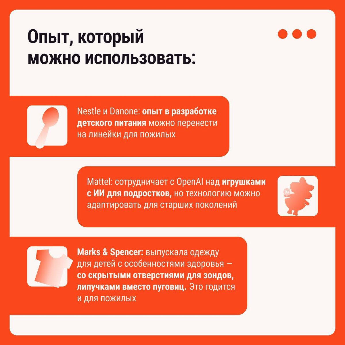 Бизнес-возможности в этом сегменте сравнимы с рынком товаров для детей, который давно и успешно развивается. Увеличение продолжительности жизни неизбежно приведёт к значительным изменениям на потребительском рынке, открывая новые горизонты для инновационных решений и предпринимательской активности.