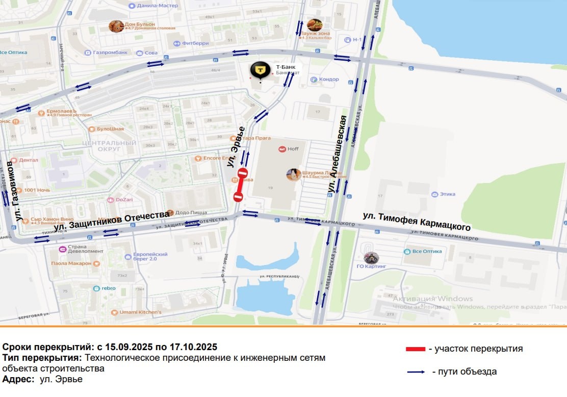 Информация для автомобилистов В связи с выполнением работ по строительству тепловой сети для подключения к системе теплоснабжения объекта капитального строительства в период с 15.09.2025 по 17.10.2025 планируется прекратить движение транспортных средств по автомобильной дороге ул. Эрвье (в районе перекрестка с ул. Защитников Отечества). Возможные пути объезда: ул. Защитников Отечества, ул. Алебашевская, ул. Газовиков. Участников дорожного движения просим обращать внимание на знаки, заранее планировать маршрут, соблюдать Правила дорожного движения РФ. Департамент дорожной инфраструктуры и транспорта