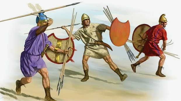 Это оружие представляло собой уменьшенное и облегченное копье на коротком древке. Длина его обычно не превышала полутора метров. Для удобства метания дротик уравновешивался. Дротиками вооружалась не только легкая пехота, но и кавалерия. Для тех времен это было эффективное оружие, способное поражать противника на расстоянии, еще до начала ближнего боя. Пехота метала дротики на дистанцию до 25 метров. Для увеличения дальности к дротику привязывали кожаный ремешок. После броска воины сразу готовились к рукопашной схватке, так как времени между метанием и столкновением было мало. Мастерство метания дротиков требовало длительных тренировок и постоянного совершенствования навыков. Воины уделяли большое внимание точности, силе броска и умению правильно оценивать дистанцию до цели. Это оружие представляло собой кожаный ремень либо сплетенную веревку с расширенной средней частью и петлей на одном конце, которую надевали на кисть руки. В расширение клали поражающий элемент, потом пращу склады