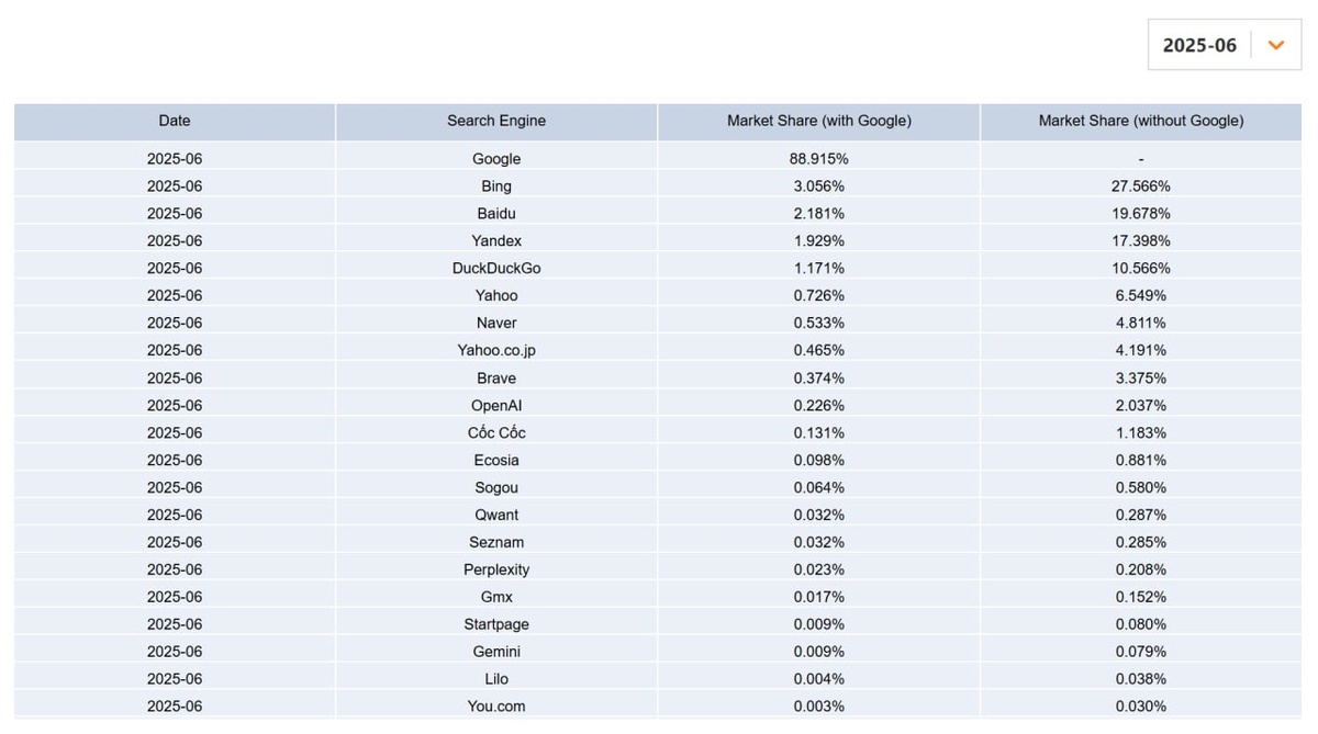 Попался отчет от Cloudflare о статистике поисковых систем в США и Европе. Если создаете контент не только на русском, то вот идеи, откуда брать трафик кроме гугла. 🔍 Обзор доли поисковиков: Q2 2025 от Cloudflare 🌍 Cloudflare, защищая и ускоряя 25+ млн сайтов (включая 17% Fortune 1000), анализирует трафик через заголовок referer — когда пользователь кликает по ссылке из поиска, мы видим, откуда он пришёл. Это позволяет оценить реальную долю поисковых систем по кликам — не запросам. 📌 Методология: — Только анонимизированные данные с reverse-прокси — Исключён бот-трафик и подзагрузки (JS, шрифты и т.д.) — Учитываются только клики, а не поисковые запросы — ОС: iOS, Android, Desktop (Win/Mac/Linux/ChromeOS), Mobile (включая игровые консоли и SmartTV) Ампилов про ИТ: https://dzen.ru/id/623d938f380f3715018b6e3c