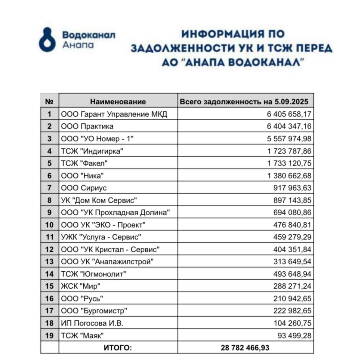 Долг управляющих компаний и ТСЖ Анапы за воду превысил 28,7 млн рублей По информации АО «Анапа Водоканал», на 5 сентября общая сумма задолженности управляющих компаний, ТСЖ и жителей города-курорта за водоснабжение и водоотведение составил 28 782 466,93 рублей. — Основными должниками остаются управляющие компании и ТСЖ, которые систематически не исполняют свои договорные обязательства. Уклонение от оплаты негативно сказывается на качестве предоставляемых услуг и может привести к перебоям в водоснабжении. Призываем всех урегулировать свою задолженность. Ответственное отношение к своим обязательствам — залог стабильного водоснабжения и надежной инфраструктуры нашего города,- прокомментировали в Водоканале. Напомним, с 1 июля стоимость кубометра питьевой воды в Анапе повысилась до 60,35 рублей (ранее 55,08), стоимость водоотведения — до 41,93 рублей (ранее 38,30 рублей). Подписывайтесь на Новости Анапы