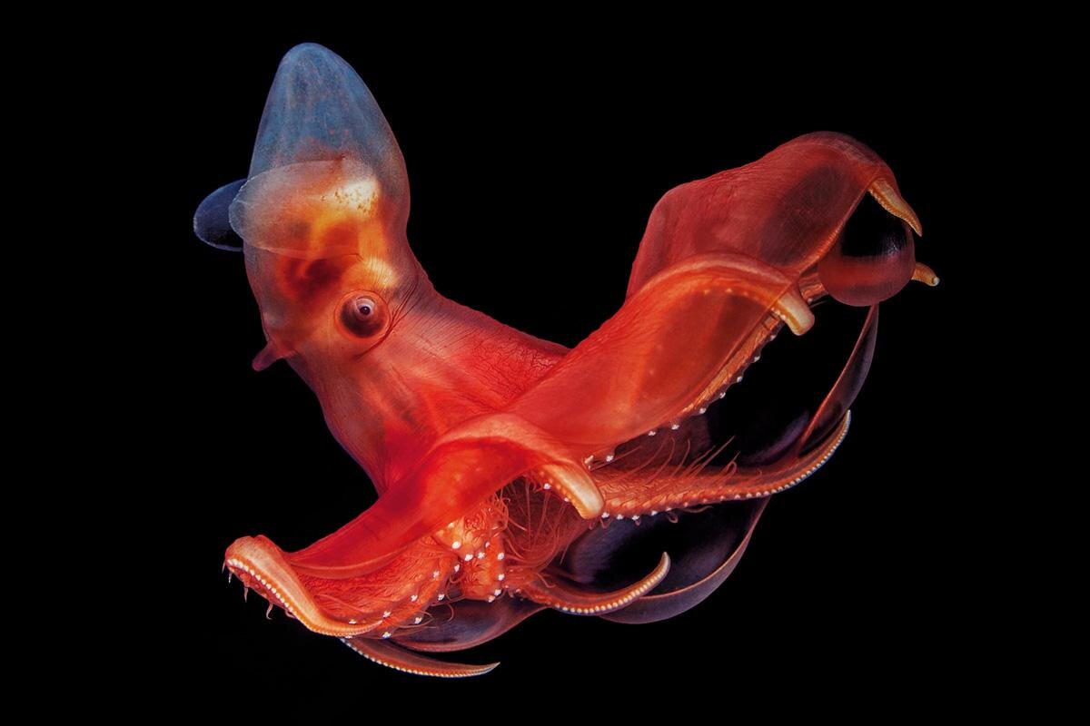 Кальмар-вампир получил свое название из-за темного цвета тела и длинных щупалец, которые напоминают плащ вампира. Слово "infernalis" в научном названии переводится как "адский", что добавляет этому существу еще больше мистики. Эти кальмары обитают на глубине от 600 до 1200 метров, где царят полная темнота и высокое давление. Их способность выживать в таких условиях делает их настоящими мастерами глубоководной жизни. Одной из самых удивительных особенностей кальмара-вампира являются светящиеся органы, известные как фотрофоры. Эти органы позволяют кальмару производить свет, что помогает ему общаться с другими особями, а также отпугивать хищников. Кальмар-вампир использует необычную стратегию защиты. Вместо того чтобы быстро убегать от хищников, он сворачивается в шар, выставляя напоказ свои колючие щупальца. Это делает его похожим на ежа и отпугивает потенциальных врагов. В отличие от большинства кальмаров, которые являются активными хищниками, кальмар-вампир является всеядным. Он питает