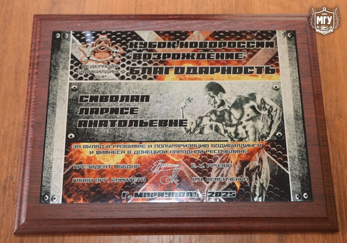 🤩 Ректор МГУ имени А.И. Куинджи Лариса Анатольевна Сиволап получила благодарность за вклад в развитие и популяризацию бодибилдинга и фитнеса в Донецкой Народной Республике. ✅ Благодарность получена от Президента Федерации бодибилдинга ДНР Екатерины Грузан и Главы организационного комитета Антона Семенченко по итогам успешно проведённого на площадке спортивного комплекса МГУ имени А.И. Куинджи Кубка Новороссии «ВОЗРОЖДЕНИЕ». Это признание отражает активную позицию университета в поддержке здорового образа жизни и формировании спортивной культуры в регионе. 💪 МГУ имени А.И. Куинджи продолжает укреплять сотрудничество с ведущими спортивными организациями и вносить вклад в развитие студенческого спорта. #МГУимениКуинджи
