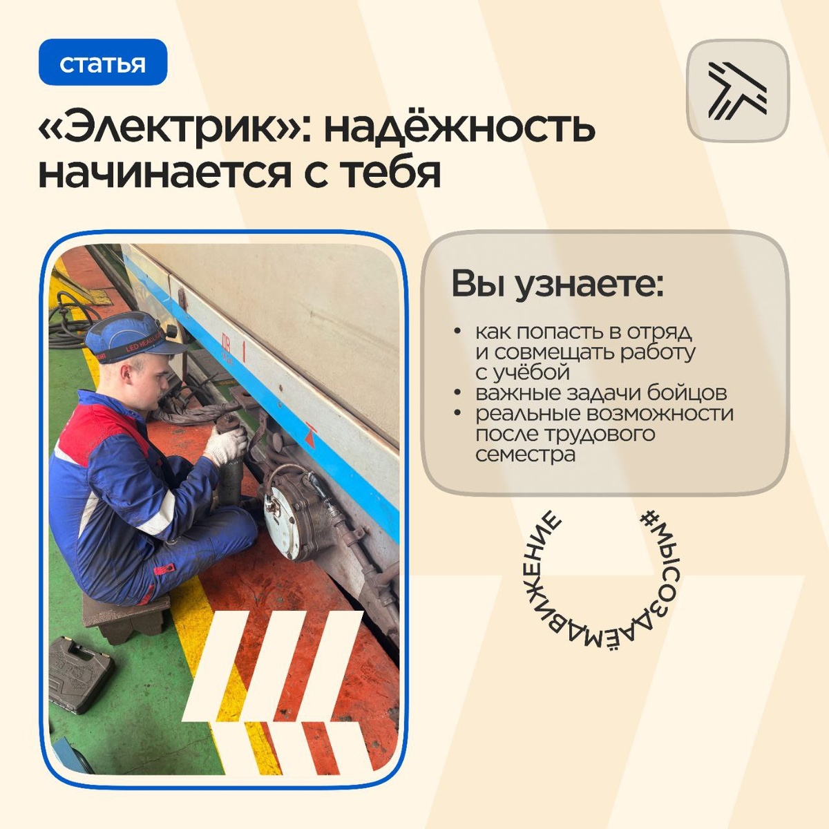 Отряд «Электрик»: надёжность начинается с тебя ➡️ Студенческий отряд «Электрик» ИТТСУ — место, где начинается надёжность работы Московского метрополитена. В статье рассказываем о бойцах, которые получают первые профессиональные навыки в московском метрополитене и делают уверенный шаг в карьеру электромехаников и специалистов по ремонту. ➡️ Вы узнаете: • как попасть в отряд и совмещать работу с учёбой • какие важные задачи выполняют бойцы • как ответственность и практика помогают в работе • реальные возможности после трудового семестра Хочешь присоединиться? Обращайтесь к Ярославу Киселёву. Будь в курсе событий РУТ