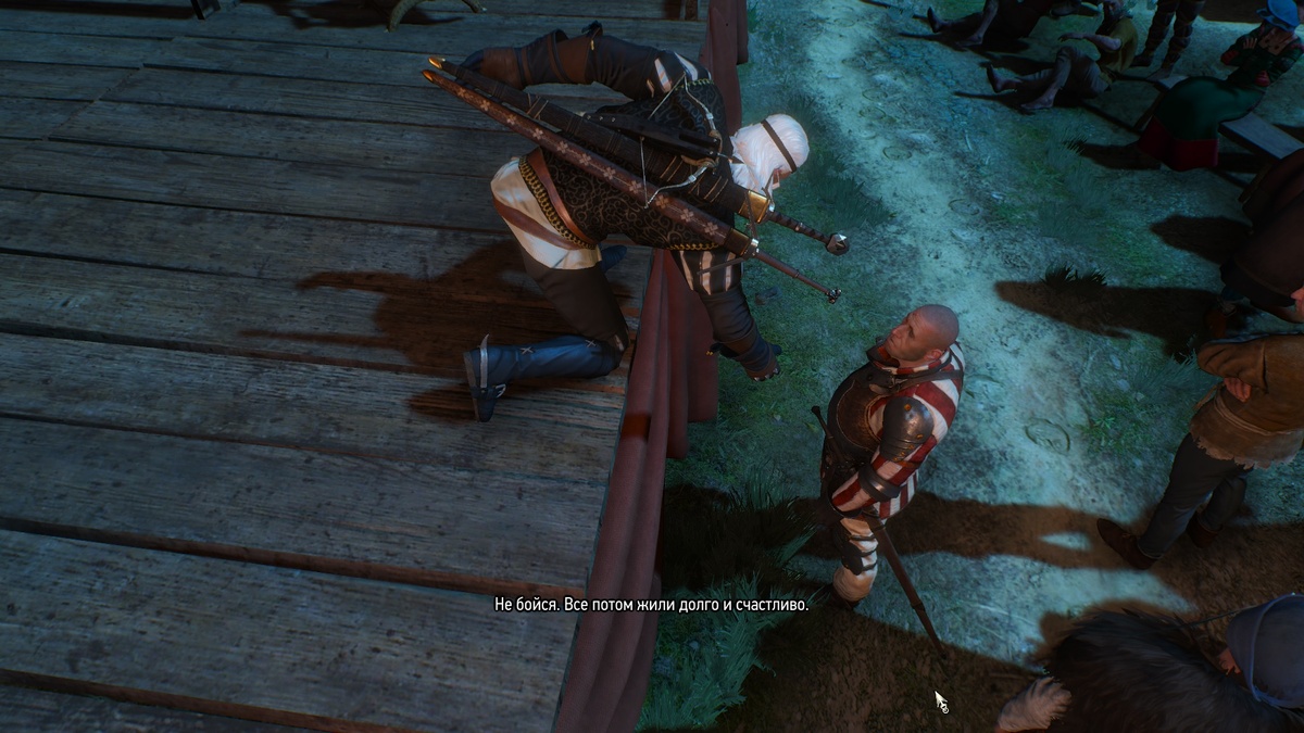 «Ай, умница, девочка!» - восхищённо подумал Геральт и, воспользовавшись моментом, напрямую обратился к лысому стражнику в зале, призывая того подняться на сцену. Похоже, зрители приняли всё происходящее за чистую монету и под под одобрительные возгласы из зала стражник подошёл к сцене.