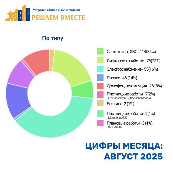 #цифрымесяца Давненько не размещали вашу любимую рубрику. Погнали! Как же август месяц порадовал нас!? 🏆 Космонавтов, 56 - 112 заявок 🏆 Космонавтов, 52 - 83 заявки 🏆 Махалина, 37 - 57 заявок 🏆 Космонавтов, 54 - 53 заявки 🏆 Махалина, 36 - 16 заявок 🏆 Чекистская, 6 - 13 заявок Общее количество заявок по всем МКД 3️⃣3️⃣4️⃣ Из них: 260 - закрыты в срок 70 - со статусом "В работе" 3 - отменены заявителем 1 - отложена на будущий период Средняя оценка за оказанные услуги за август 4,63⭐️ (высчитывается на основании Ваших оценок за выполнение) Ваши высокие оценки - наша лучшая награда 🎖 Ваша управляющая компания "Решаем вместе" 🖥 Подписаться на канал 💌 Написать нам 🥰 Оставить отзыв про УК ⚙️ Ежедневная уборка 🆕 Адрес офиса компании ул. Большевистская, д. 20 Telegram