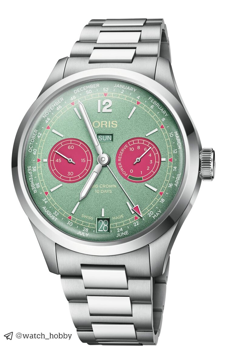 Наверное, это самая красивая вариация модели Big Crown от Oris. Помимо красоты циферблата, великолепие встречается и с обратной стороны корпуса - мануфактурный калибр Oris 113, впервые интегрированный в модель Big Crown. Что с характеристиками: - Корпус из стали - Браслет из стали - Диаметр корпуса: 43 мм - От ушка до ушка: 50.5 мм - Высота корпуса: 13.5 мм - Сатиновая и зеркальная полировка - Сапфировое стекло - Водозащита 50 метров - Полный календарь - Индикатор запаса хода - Малая секундная стрелка - Автоматический калибр Oris 113 с запасом хода в 240 часов Во-первых, механизм. Сразу. 10 дней или 240 часов запаса хода - цифры впечатляющие. Ручной подзавод - отдельный кайф. А его внешний вид 😍 Во-вторых, циферблат. Он супер яркий, очень привлекательный. Здесь полный календарь: число, месяц, день недели, порядковое число текущей недели. Все это дело сделано в оттенок циферблата и не выделяется. Метки над индексами, кончик стрелки и два субциферблата выполнены в контрастном малино