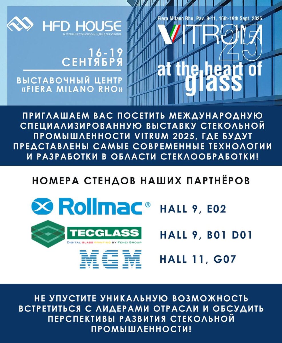 🇮🇹HFD House на Vitrum 2025: встречаемся в Милане! Приглашаем вас на крупнейшую международную выставку стекольной промышленности Vitrum 2025, где будут представлены самые современные технологии и разработки в области стеклообработки! 🗓 16–19 сентября 2025 года 📍 Выставочный центр «Fiera Milano Rho», Милан, Италия 📌 До встречи на стендах наших партнеров: - Валковая покраска Rollmac: зал 9, стенд E02 - Цифровая печать Tecglass: зал 9, стенды B01, D01 - Сборка стеклопакетов MGM: зал 11, стенд G07 ✔️ Не упустите возможность: - Увидеть новейшее оборудование и технологии. - Обсудить тренды и перспективы отрасли с лидерами рынка. - Найти идеи для развития вашего производства! 💬 Пишите — расскажем обо всех деталях! #vitrum2025 #hfdnews