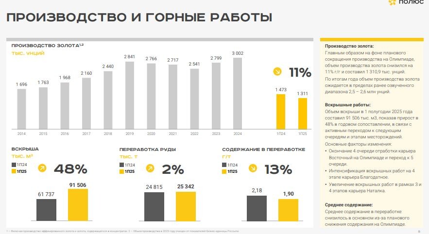 ▫️Капитализация: 3104 млрд ₽ / 2281₽ за акцию ▫️Выручка TTM: 756,4 млрд ₽ ▫️Опер. прибыль TTM: 476,2 млрд ₽ ▫️Прибыль TTM: 335,2 млрд ₽ ▫️Скор. прибыль TTM: 336,1 млрд ₽ ▫️Скор. P/E TTM: 6,4 ▫️fwd дивиденд 2025: 7,5% ✅ Благодаря безостановочному росту цен на золото, компания смогла сохранить скорректированную чистую прибыль за 1п2025 на уровне 117,8 млрд р (+0,4% г/г). Больше 70 млрд рублей принесли курсовые разницы и операции с ПФИ, поэтому нескорректированный показатель вырос сильнее. 👆 Под влиянием крепкого рубля TCC за 1п2025 выросли до $653 за унцию (+54% г/г), а полная себестоимость производства унции отдельно за 2кв2025 превысила $1000. ✅ Сейчас сложилась такая ситуация, что даже если будет коррекция цен на золото, то это частично будет компенсировано девальвацией рубля, что снижает риски. ✅ Чистый долг с начала года сократился аж на 117,1 млрд р до 507,6 млрд р. ND/скор. EBITDA = 1, что очень комфортно. ✅ СД рекомендовал дивы 70,85р на акцию, что без учета казначейского пакета