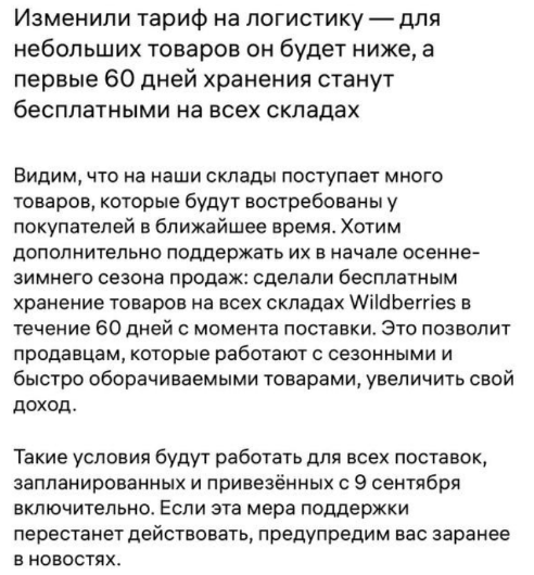 Свежие «радостные» новости от WB: вроде бы для мелких товаров логистика дешевеет, но в реальности — многие продавцы получат рост затрат до 30–47%. Давайте разберёмся, что поменялось и кого это коснётся. В анонсе звучит красиво: Да, для мелких товаров (до 1 л) появились новые градации и немного снизились ставки: Но! Для товаров свыше 1 литра логистика резко подорожала: Возьмём сумку объёмом 3 литра. Рост почти на 30%. И это без всяких «дополнительных условий». Изменения распространяются на все схемы — и ФБС, и ФБО. Хранение действительно будет бесплатным 60 дней для всех товаров, привезённых после 9 сентября. Для мелких товаров новость приятная. Для всего остального — очередной удар по марже. Продавцам придётся снова пересчитывать экономику и смотреть, где ещё можно оптимизироваться. Как вам новости, делитесь в комментариях?