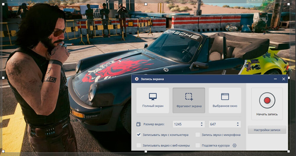 2. Задайте один из трех режимов захвата и укажите настройки. Можно установить ширину и высоту кадра, источник звука, добавить подсветку курсора. Когда все будет готово, кликните «Начать запись».