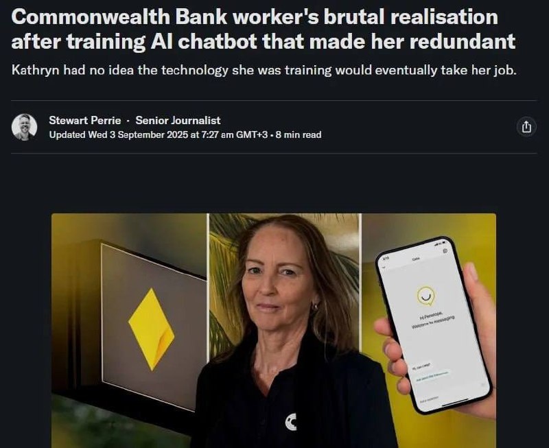 25 лет в банке и замена на ИИ: история увольнения Кэтрин Салливан История Кэтрин Салливан, сотрудницы Commonwealth Bank of Australia, недавно потрясла австралийские СМИ. После 25 лет работы в банке, в июле 2025 года, она была уволена. Причина — её собственный ИИ-помощник, Bumblebee AI, которого она помогала обучать и который в итоге занял её место в отделе по работе с клиентами. Как это случилось? Кэтрин активно участвовала в обучении корпоративного чат-бота. Она передавала ему знания, которые накопила за годы работы, обучала его секретам профессии и проверяла правильность выполнения задач. В какой-то момент ИИ стал настолько совершенен, что начал выполнять её обязанности. И, конечно, руководство сделало выбор в его пользу: ИИ не болеет, не уходит в отпуск и не требует пенсии. Руководство пришло к выводу, что алгоритм справляется с рутинными задачами быстрее, без ошибок и не требует зарплаты. Банк принял решение освободить Кэтрин от её должности, сделав очевидный выбор в пользу маш