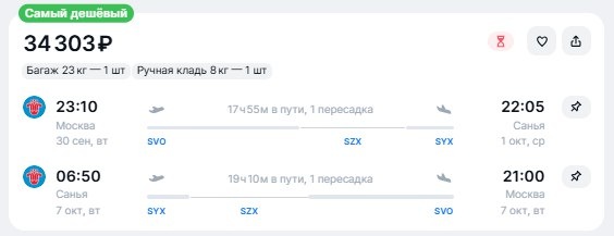 ✈️Москва - Санья (Китай), туда и обратно с пересадкой за 34300 рублей. Багаж входит в стоимость 30 сентября - 7 октября - https://checkintime.ru/6rle 🏖 Поиск туров | ✈️Авиабилеты