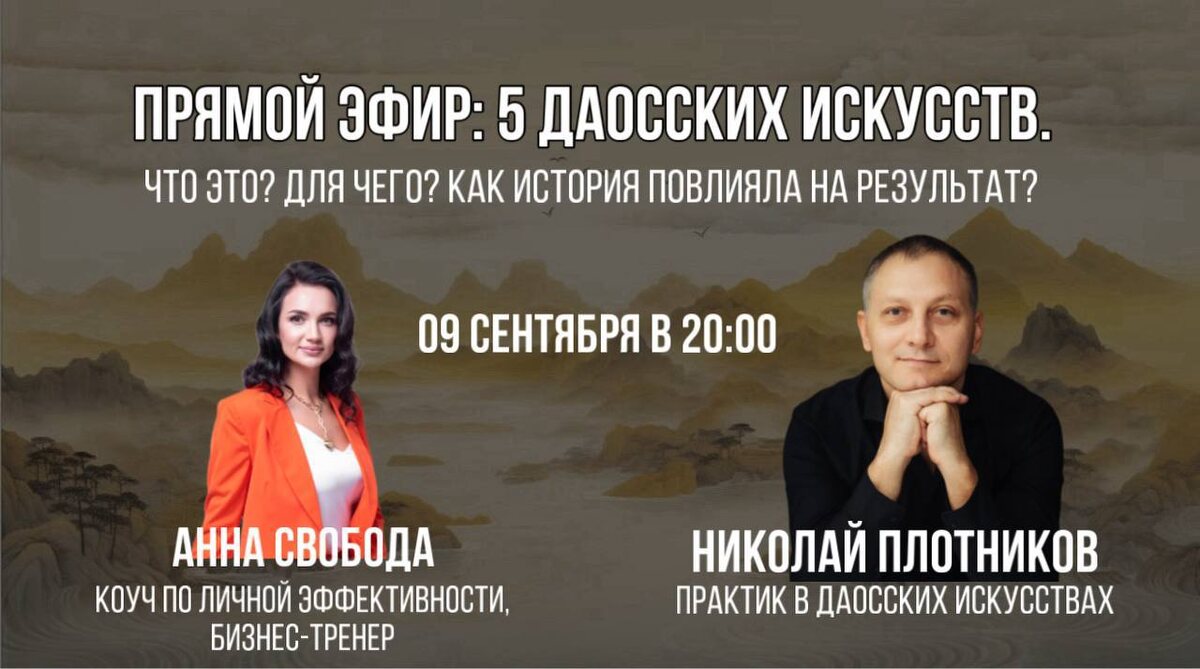 Когда начинаешь соприкасаться с даосскими науками, это все кажется каким-то непонятным волшебством. Погружаясь в них все глубже и глубже, понимаешь что за этим стоит исследовательская работа естествоиспытателей (если это можно так назвать), которые стремились прожить дольше и качественнее, стремились к бессмертию и счастью здесь и сейчас. Но, об этом, я буду рассказывать сегодня в прямом эфире с Анной Свобода - кочуем, спикером и просто приятной женщиной. Сегодня 09.09 в 20:00! Поговорим о «Пяти даосских искусствах». Даже если вам знакомо такое понятие, приходите послушать, думаю, что вы сможете открыть что-то новое для себя. 👉 Ставьте «+» в комментариях, если будете с нами! Так я пойму, что вам интересно. 👉 Делитесь этим постом с друзьями, кому может быть полезна эта тема! 📍Ждем вас 9 сентября в 20:00 (по МСК) в прямом эфире в телемосте по ссылке: https://telemost.yandex.ru/j/86866304411164 ✅Подписывайтесь👇🏻 Мой канал: https://dzen.ru/id/6051a90fbf88bc3c54290f28 Канал Анны