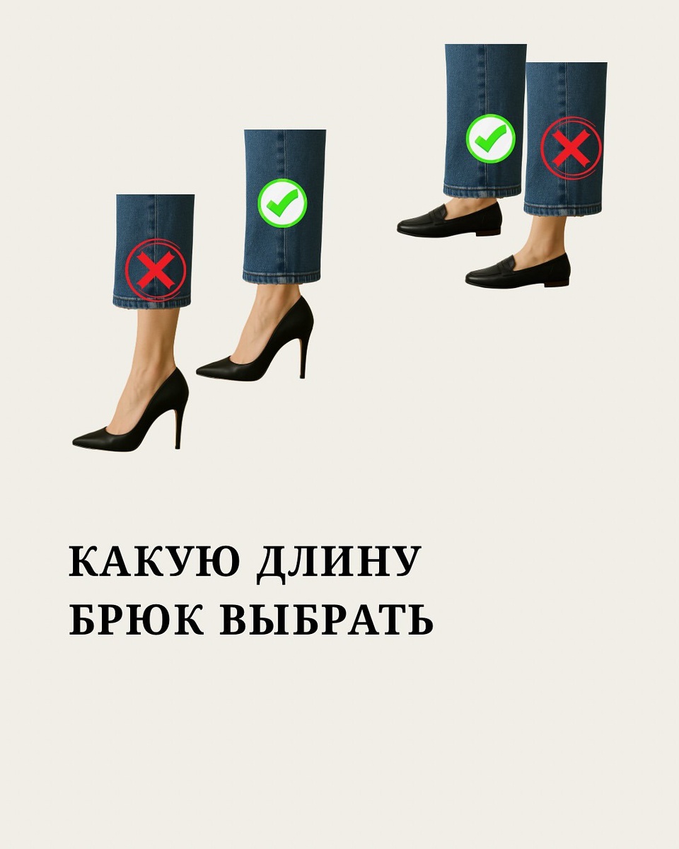 ✔️ До косточки — щиколотка открыта, каблук видно, силуэт вытянут. ✔️ Чуть прикрывают каблук — ноги становятся длиннее, фигура стройнее. ✘ В пол — мнутся, пачкаются и утяжеляют низ. ✘ На голени — «отрезают» ногу, делают короче. 👟 Без каблука ✔️ До щиколотки — универсально и элегантно. ✔️ До косточки — идеально для кроссовок, лоферов, балеток. ✘ На голени — создаёт квадратный силуэт, ноги короче. ✘ Сильно длинные — топорщатся на обуви и выглядят неряшливо. Стиль — это когда даже длина брюк работает на тебя. Именно такие нюансы мы разбираем в клубе «Сила стиля». Там ты получаешь готовые шпаргалки, подборки с ссылками и капсулы на каждый сезон. А главное — поддержку и ответы на свои вопросы, чтобы твой гардероб начал работать на тебя, а не наоборот. 👉 Присоединяйся — https://lichtstyle.com/styleclub