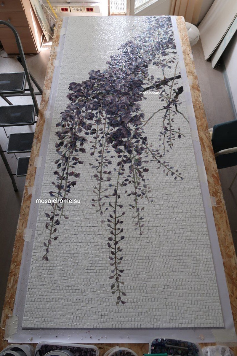 Для фона выбрана белая матовая мозаика, выложенная волной