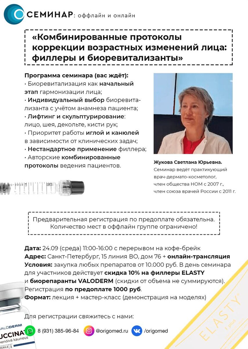 🔥 Анонс семинара 24.09 🔥 Друзья! Рады анонсировать долгожданный семинар по филлерам ELASTY и биорепарантам Валодерм на тему: «Комбинированные протоколы коррекции возрастных изменений лица: филлеры и биоревитализанты» 🔥 Пройдёт он 24.09 (среда) в 11:00. 🏠 Проходит оффлайн в Петербурге + трансляция в высоком качестве для врачей из регионов 💕 👩⚕️ Спикер - Жукова Светлана Юрьевна - практикующий врач-дермато-косметолог, член общества НОМ с 2007 г., член союза врачей России с 2011. 🔹 Тема: «Комбинированные протоколы коррекции возрастных изменений лица: филлеры и биоревитализанты» 🔹 На семинаре вас ждёт (программа семинара): • Биоревитализация как начальный этап гармонизации лица; • Индивидуальный выбор биоревитализанта с учётом анамнеза пациента; • Лифтинг и скульптурирование: лицо, шея, декольте, кисти рук; • Приоритет работы иглой и канюлей в зависимости от клинических задач; • Нестандартное применение филлера; • Авторские комбинированные протоколы ведения пациентов. Для рег